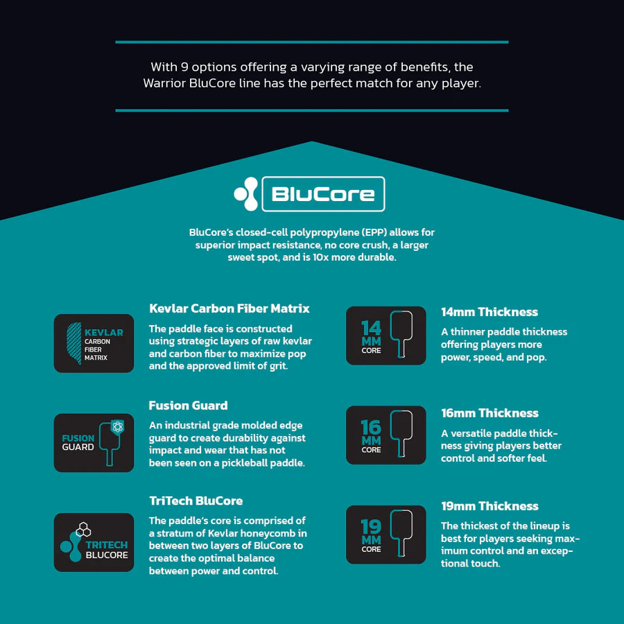 Lanzada en mayo de 2025, la serie Warrior BluCore representa la apuesta más ambiciosa de Diadem hasta la fecha: una familia de nueve palas diferentes que combinan tres grosores (14mm, 16mm, 19mm) con tres formas distintas (Pro, Standard, Max), todas ellas construidas sobre la innovadora tecnología BluCore.
